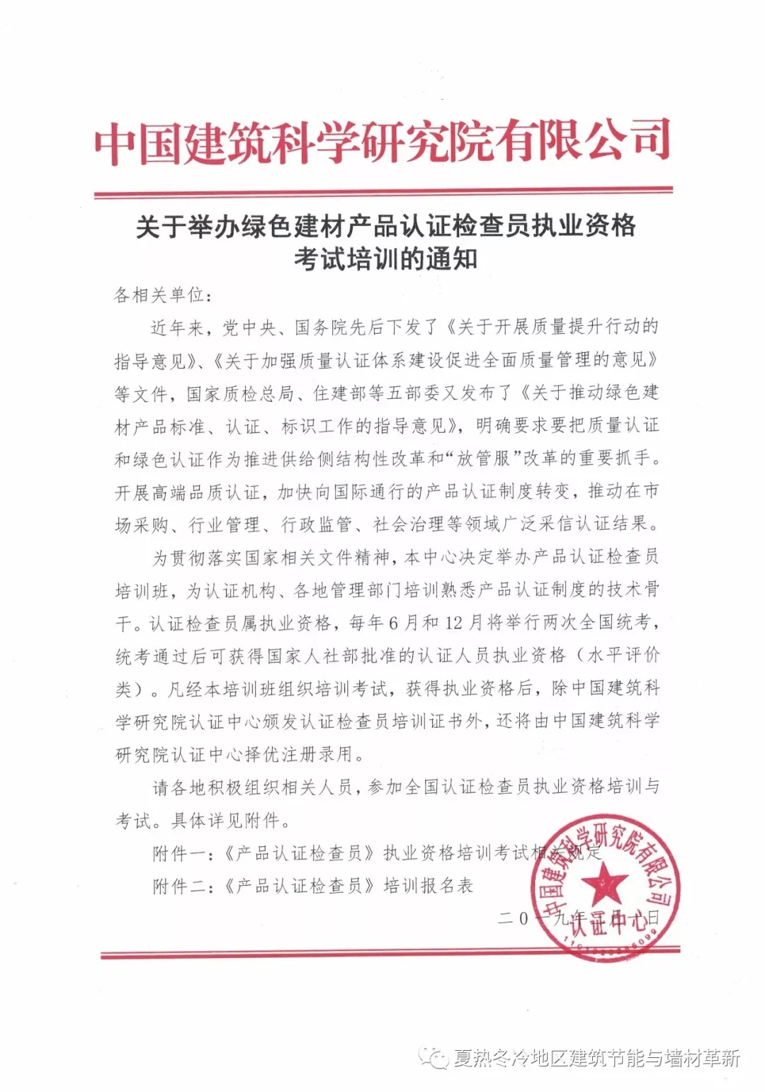 关于举办绿色建材产品认证检查员执业资格考试培训的通知